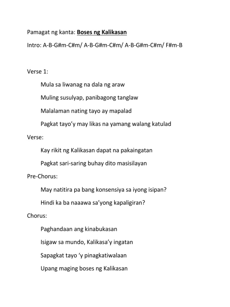Original lyrics of sigaw ng kalikasan song by lhirikoh familia. Browse for Halimbawa Ng Awit Tungkol Sa Inang Kalikasan song lyrics by entered search phrase. Explore 2 meanings and explanations or write yours.