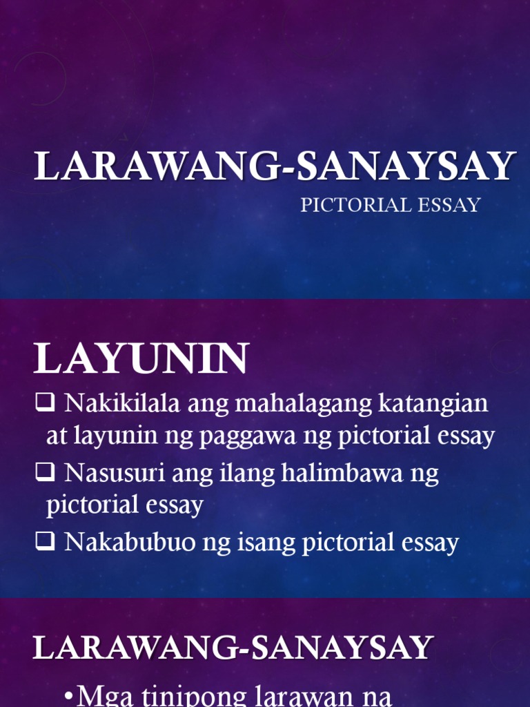 Akademikong sulatinPosisyong papel 8. Ang larawang-sanaysay na tinatawag sa Ingles na pictorial essay o kaya ay photo essay na para sa iba ay mga tinipong larawan na isinaayos nang may wastong pagkakasunod-sunod ng mga pangyayari upang maglahad ng isang konsepto. Ang Kalikasan ng Pag-uugali Ikatlong Salik.